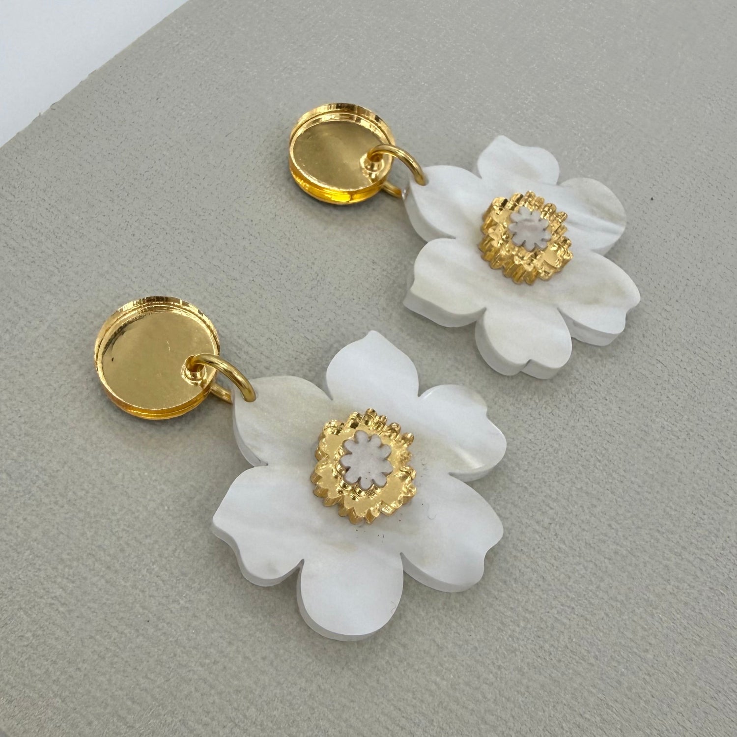 These pretty blossom earrings are made from marble, mirror and glitter acrylic pieces. Each piece is hand assembled with care in limited quantities.