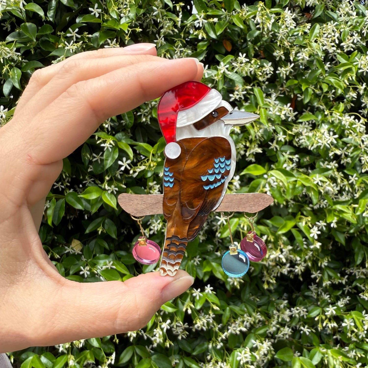 Get into the Christmas spirit with this delightful iconic Kookaburra sitting upon a wood branch with christmas baubles.
