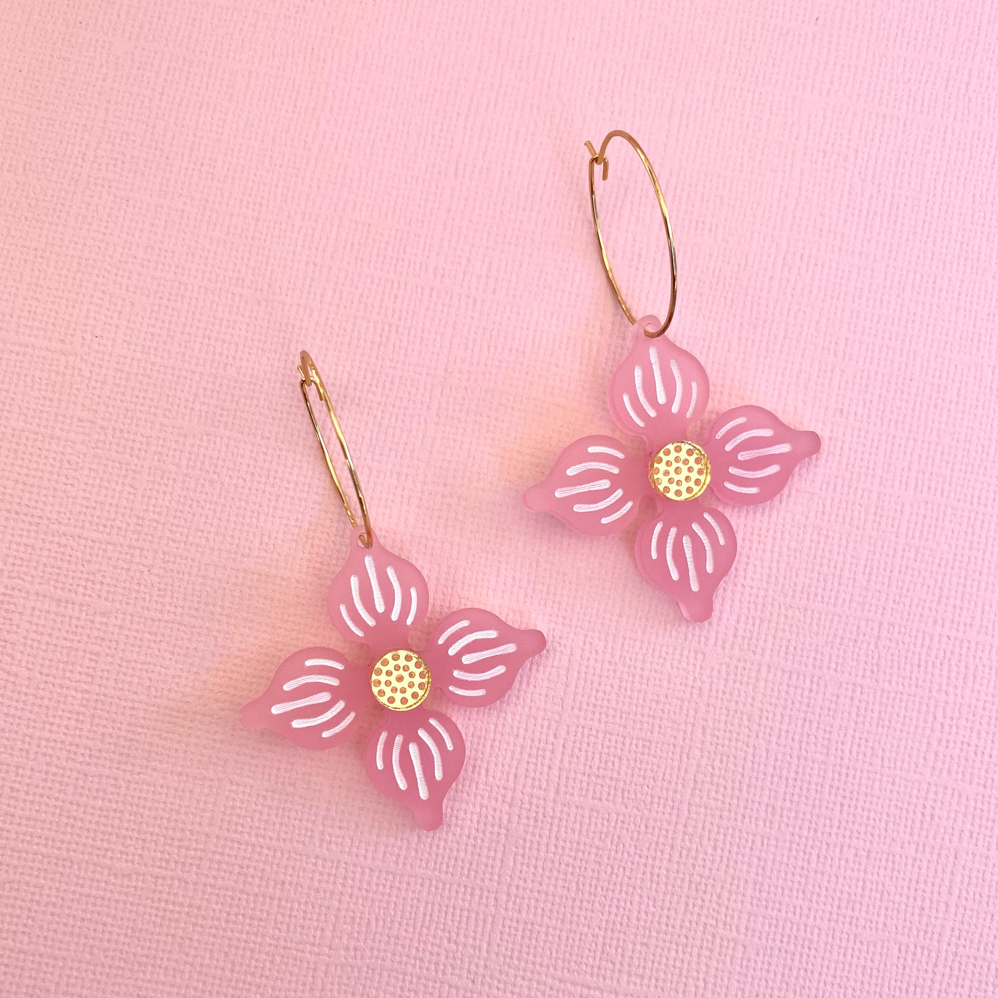 Each flower is laser cut from frosted acrylic that has been etched and hand painted. There is a pretty mirror gold centre to compliment the gold hoop.