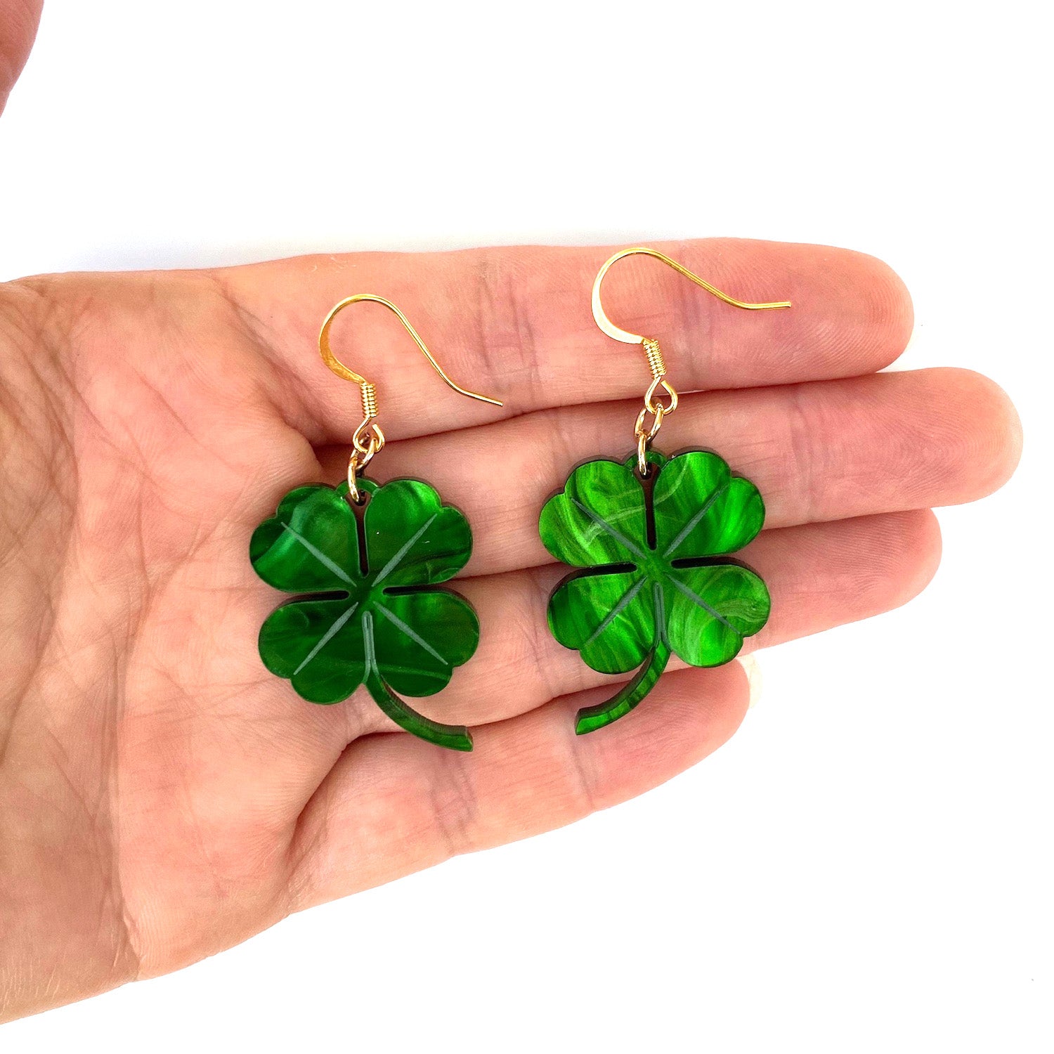 Everyone needs a bit of good luck. These dangly four leaf clover earrings are made from the most luscious green marble acrylic that matches my Four Leaf Clover brooch.