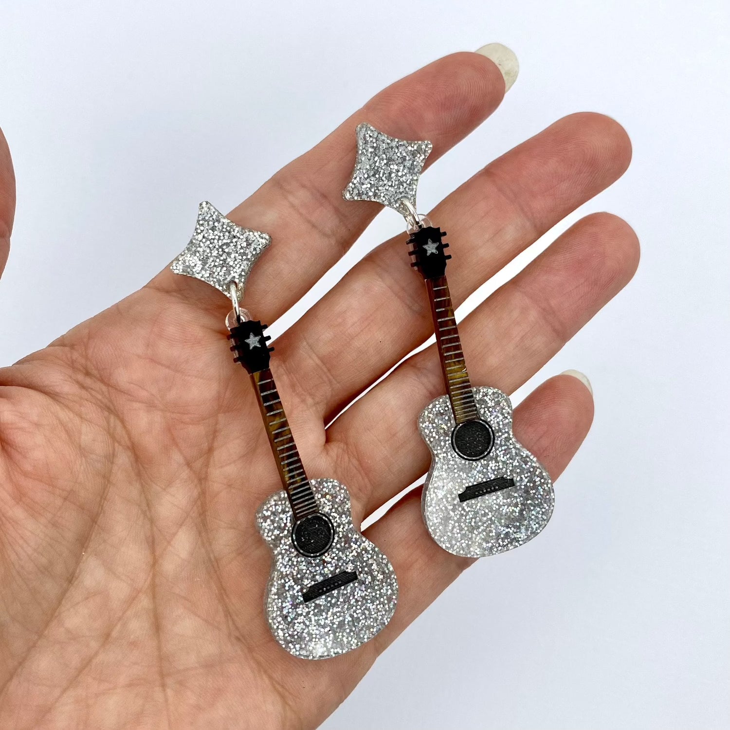 Celebrate your love for music with these sparkling silver holographic glitter guitar earrings.