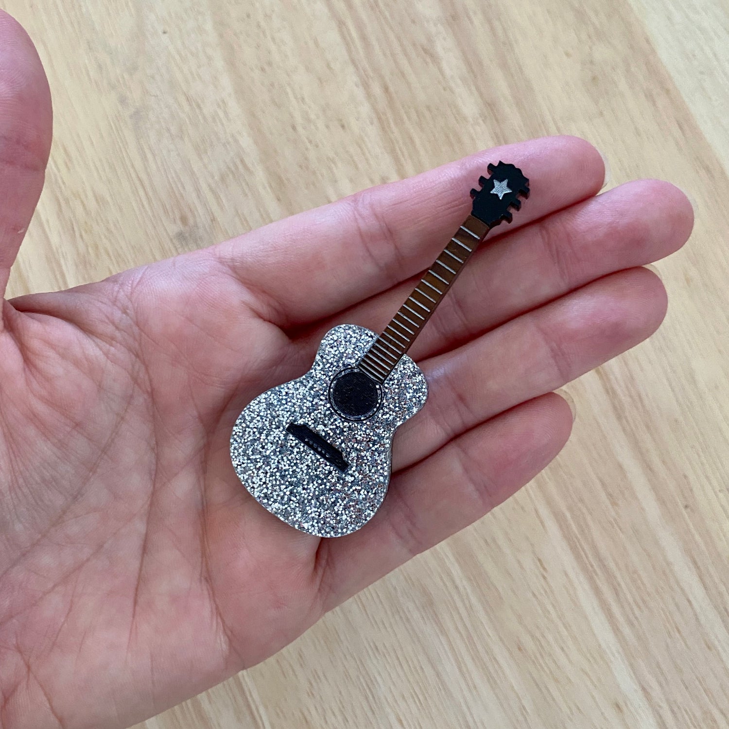Celebrate your love for music with this sparkling silver holographic glitter guitar brooch.