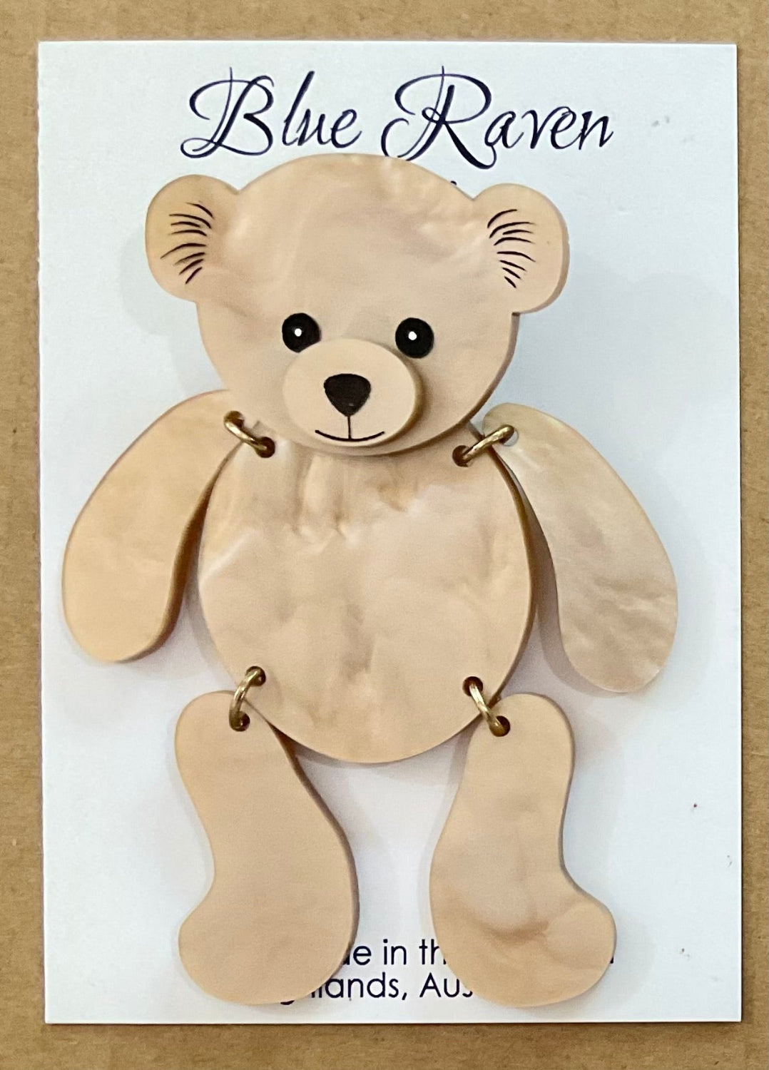 This brooch of cuteness is made from a lovely caramel coloured marble acrylic. His arms and legs are attached with gold jump rings and dangle from his round body.