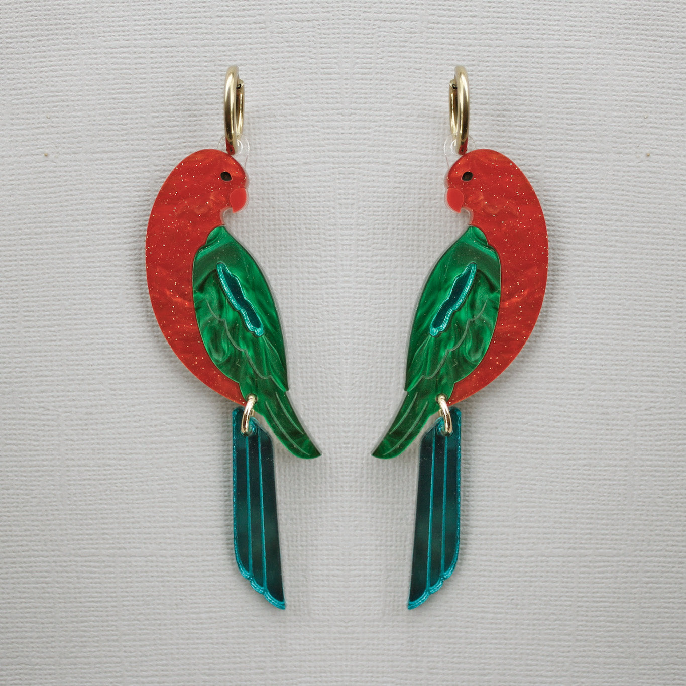 These earrings depict the parrots in a perched position, facing each other (or opposite each other depending on how you wear them).