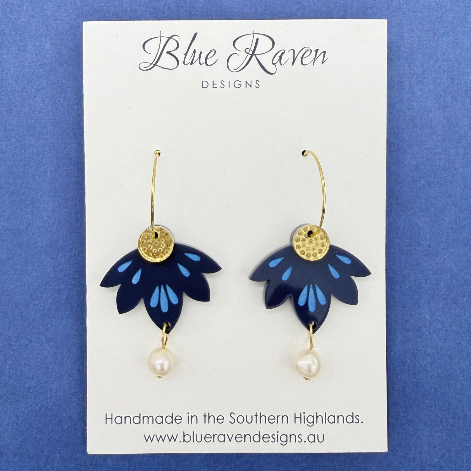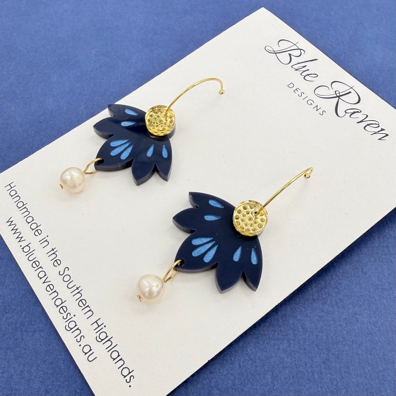 Each flower is laser cut from acrylic that has been etched and hand painted. There is a gold mirror centre at the top and a genuine white freshwater pearl hangs from the bottom. The hoops are made from 304 stainless steel with gold plating.