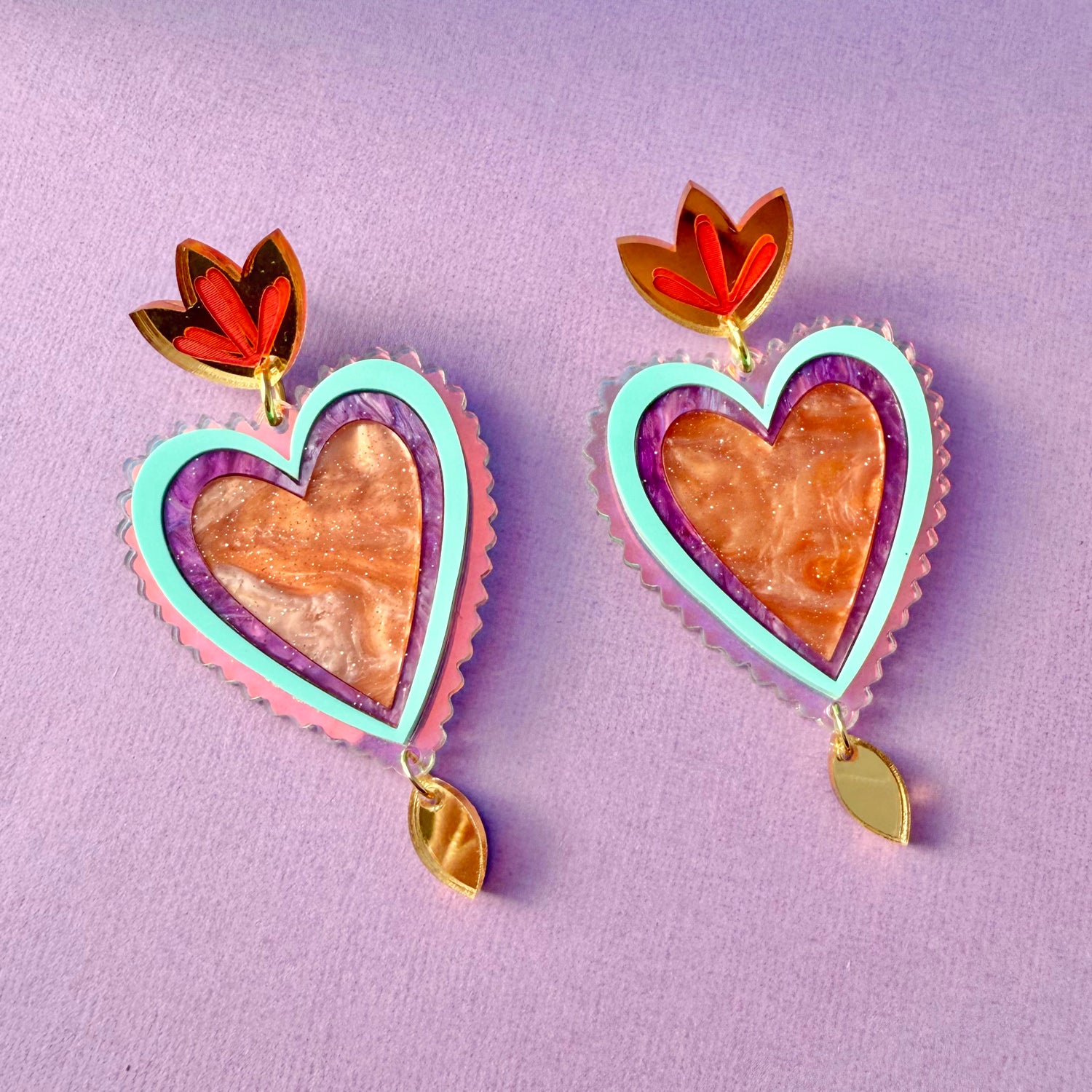 Heart measures 43mm W x 60mm H (including the gold mirror dangle). They hang from a 21 x 18mm mirror stud with stainless steel posts (84mm in total).