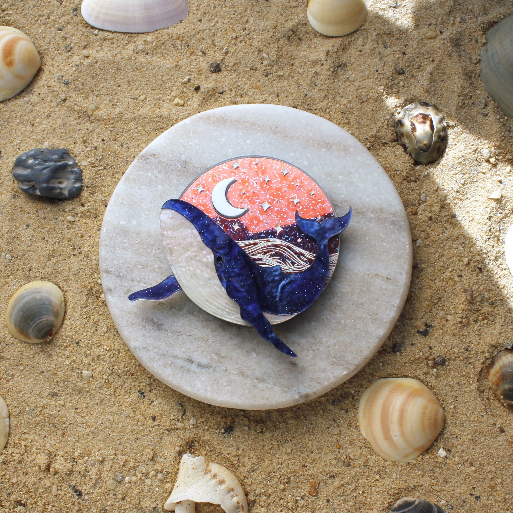 This brooch is one that brings serenity and peace as you gaze into it; the starry night sky, the undulating sea as a whale comes up for air.