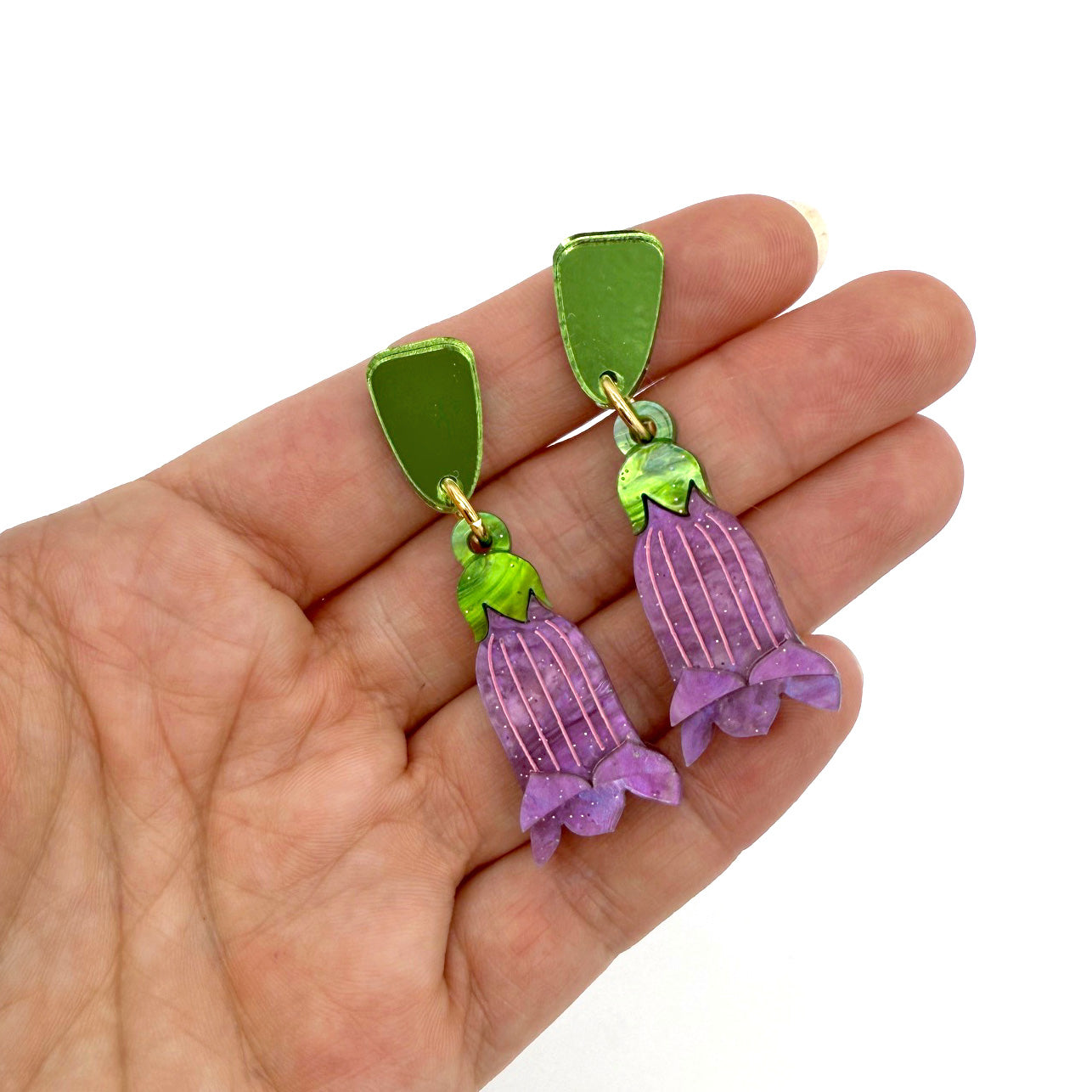 Each flower measures 16mm (w) x 35mm (h) and hangs from a 16mm acrylic stud with stainless steel posts. Overall length is 53mm.