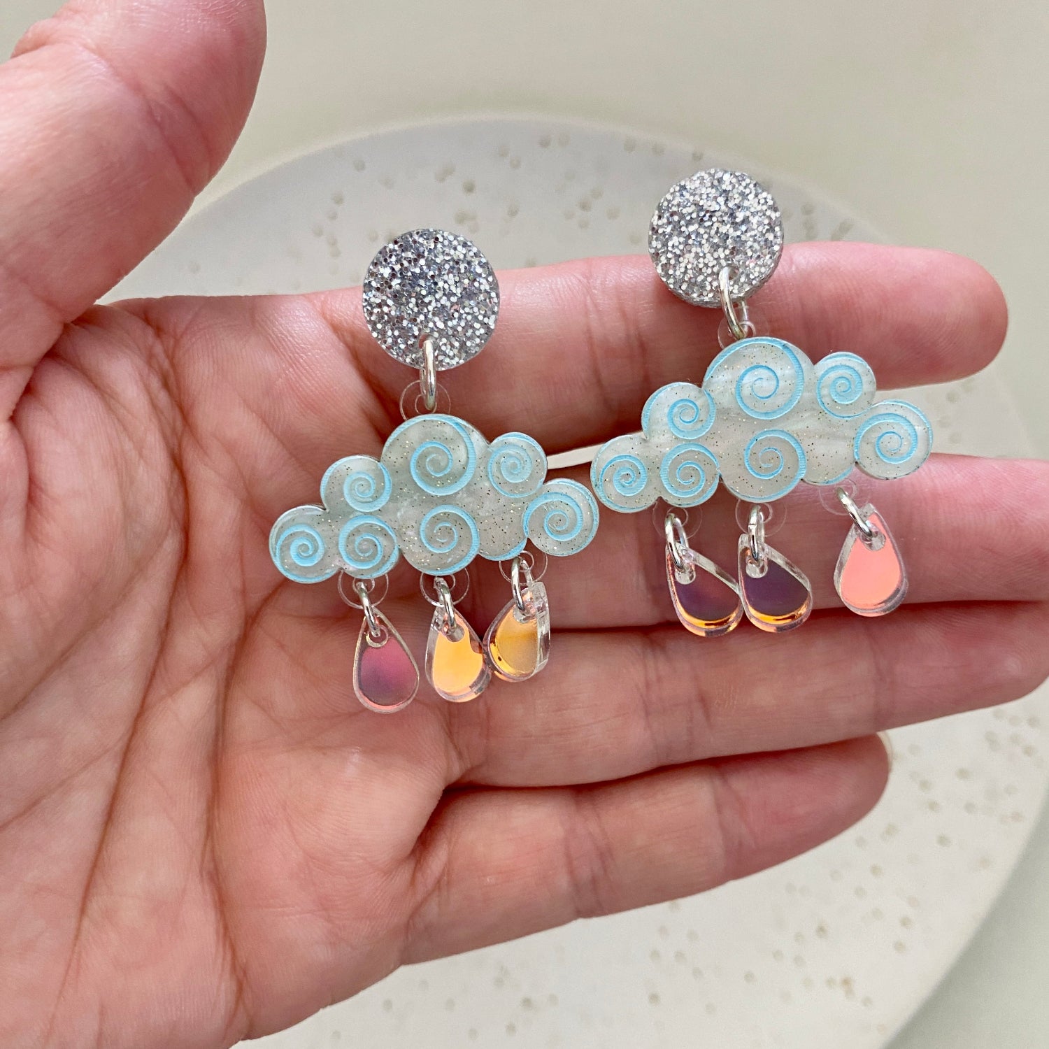 These dreamy cloud earrings are made from beautiful blue swirl and glitter acrylics with iridescent rain drops. They are sure to add a little magic to your outfits.