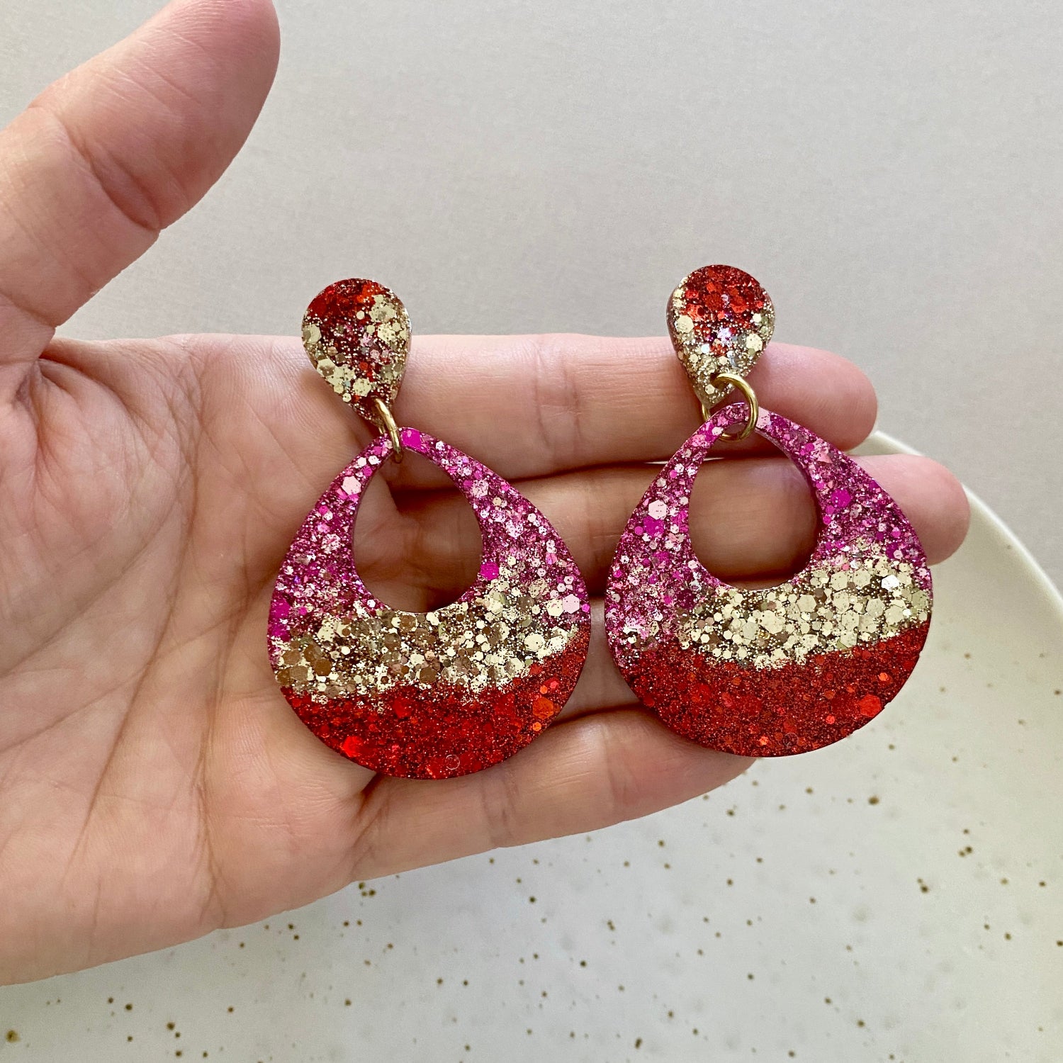 These beautiful earrings have been hand poured with a mixture of red, pink and gold glitter. They are gorgeous and sparkle and shimmer so much!