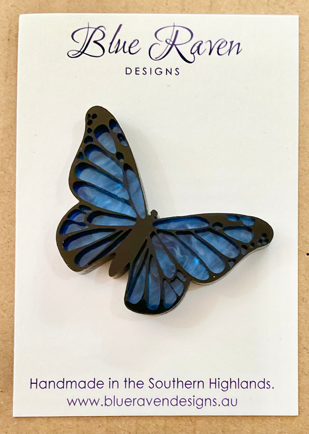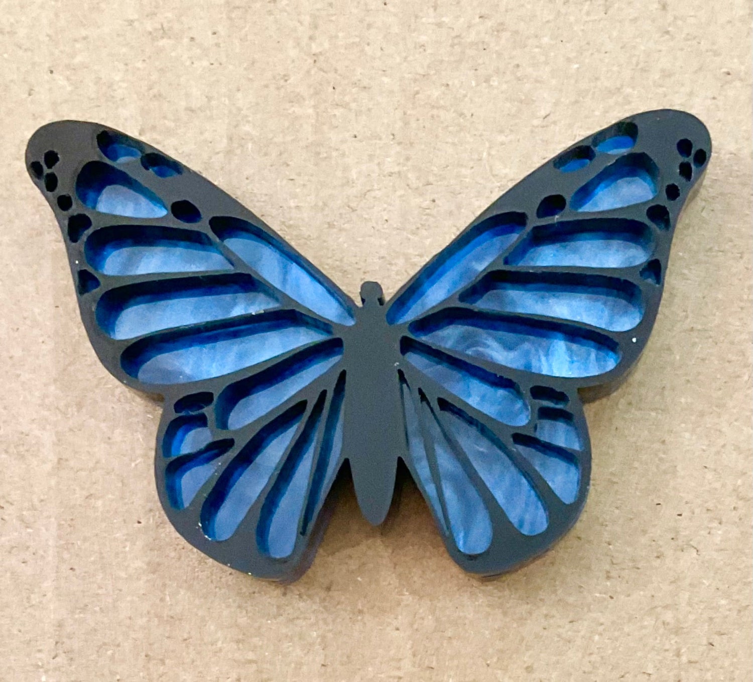 Just another brooch I made for fun! Black cut-out acrylic layered on a deep blue marble acrylic.