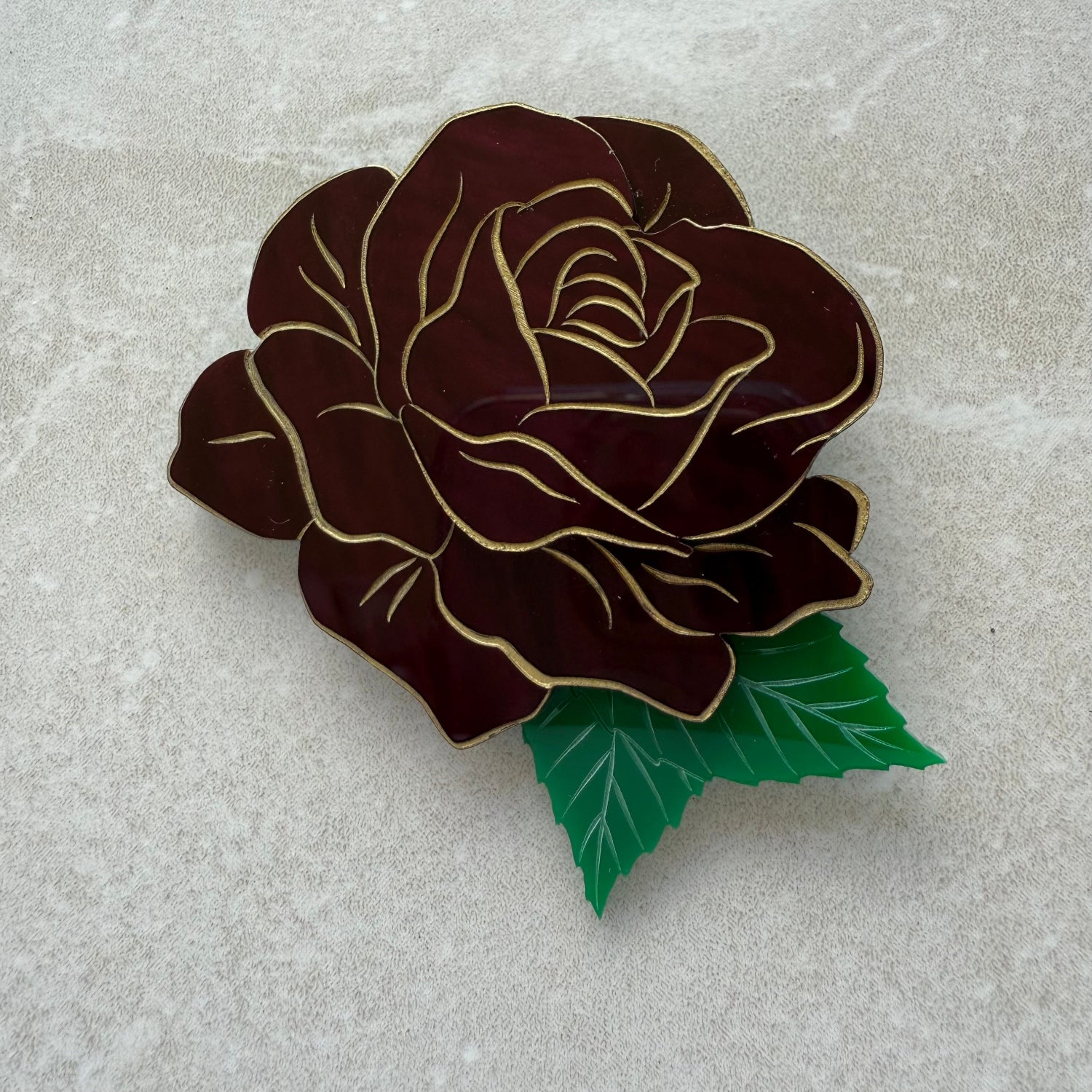 This rose brooch is made from stunning 3 mm dark burgundy marble acrylic. The bottom layer is plain, dark green acrylic with etched accents on the leaves. The purple rose has also been etched with gold paint added to accentuate the detail in the petals.