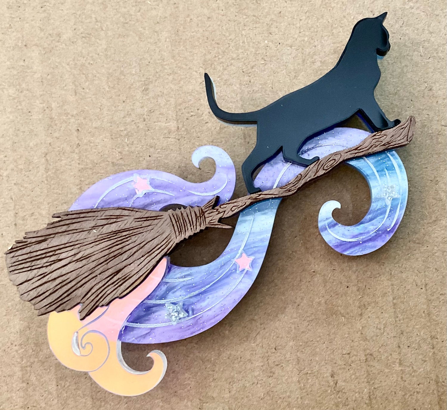This striking brooch is made from layers of beautiful purple and blue marble acrylic with tiny flecks of silver. A black Salem sits upon an etched wood broomstick as he flies through the sky, leaving behind a magical swirl of iridescent acrylic.