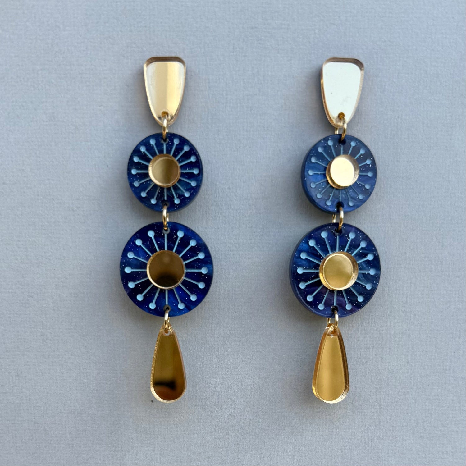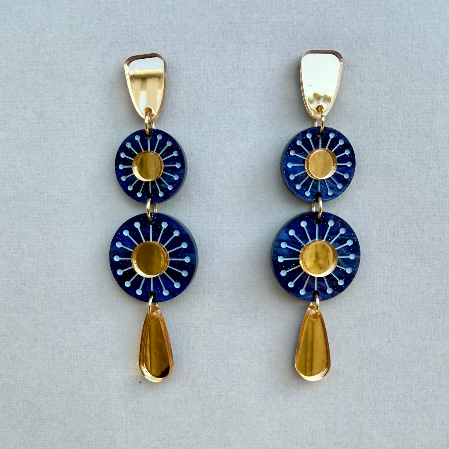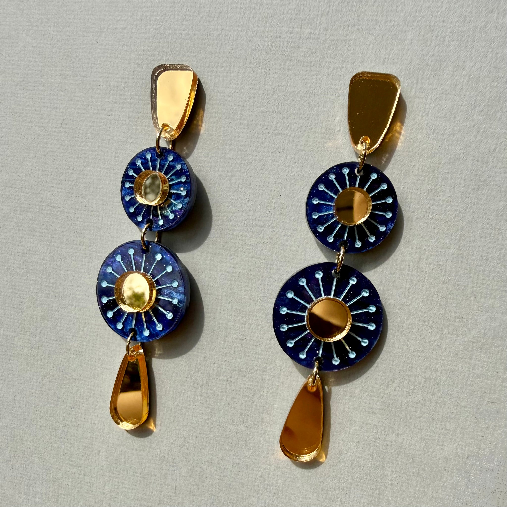 They are made from gold mirror and blue marble acrylic that has been etched and hand painted.