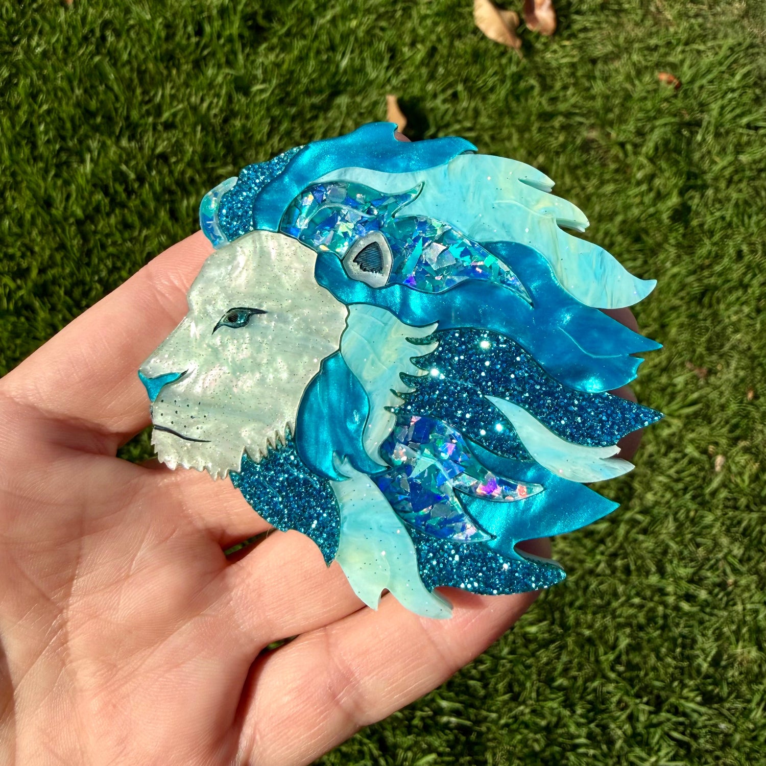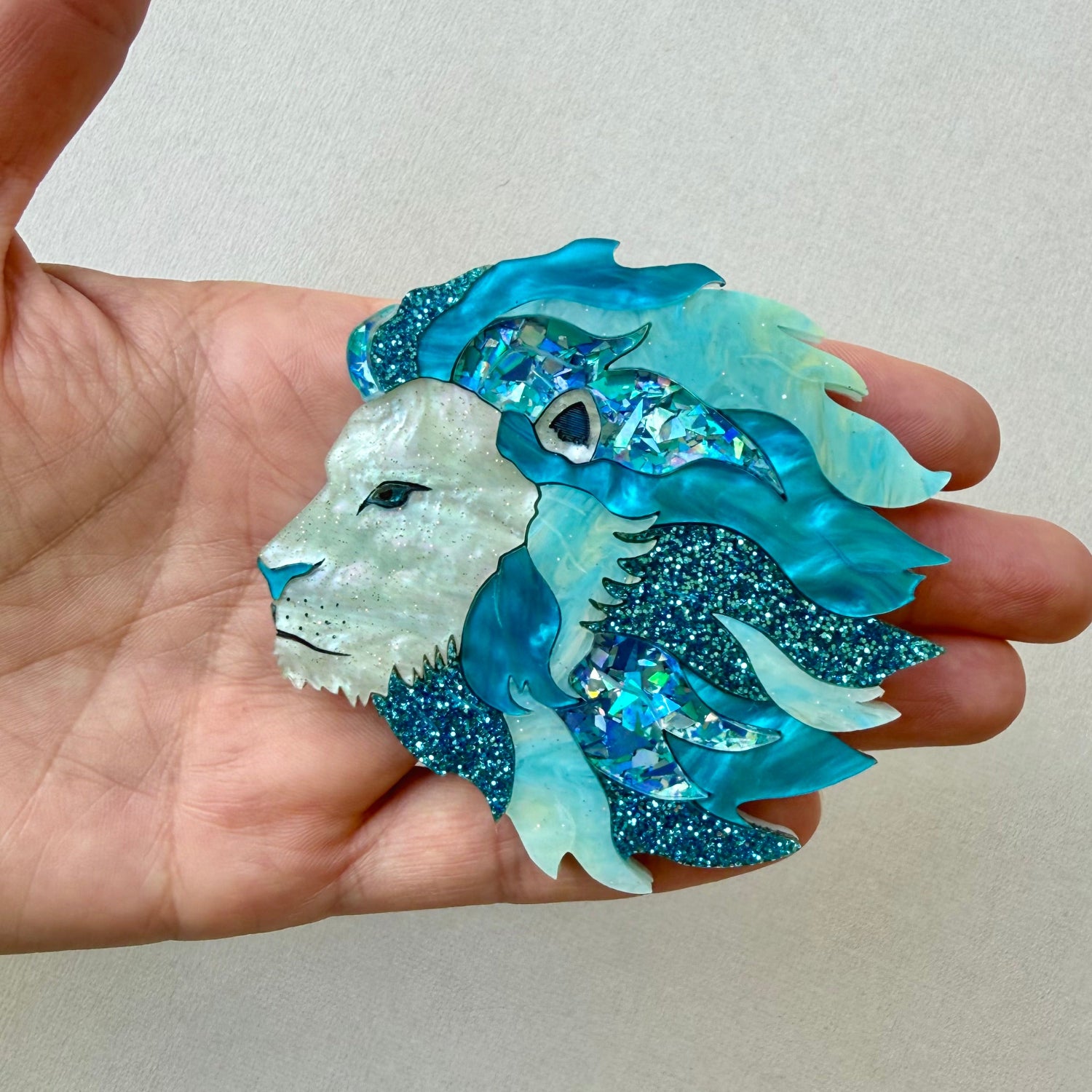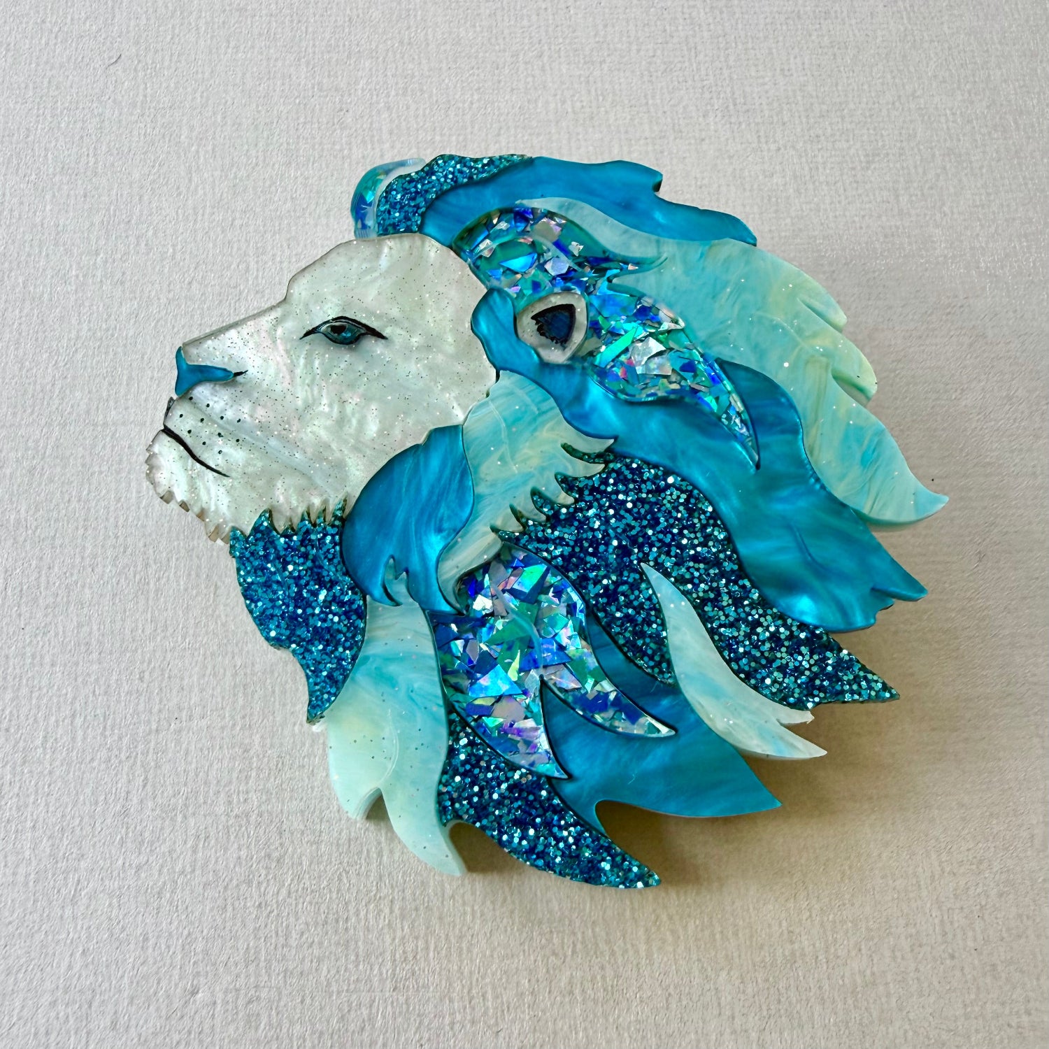 The brooch is 75 x 70 mm and is approximately 6mm thick. It consists of 20 pieces of 3mm thick laser-cut acrylic. This colourful version of Cecil is a mixture of marble and glitter acrylics.