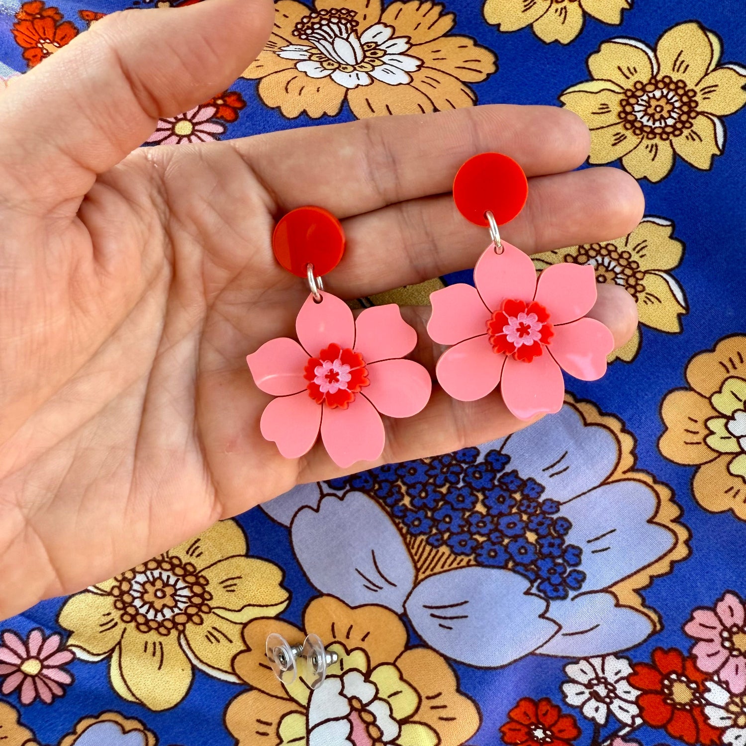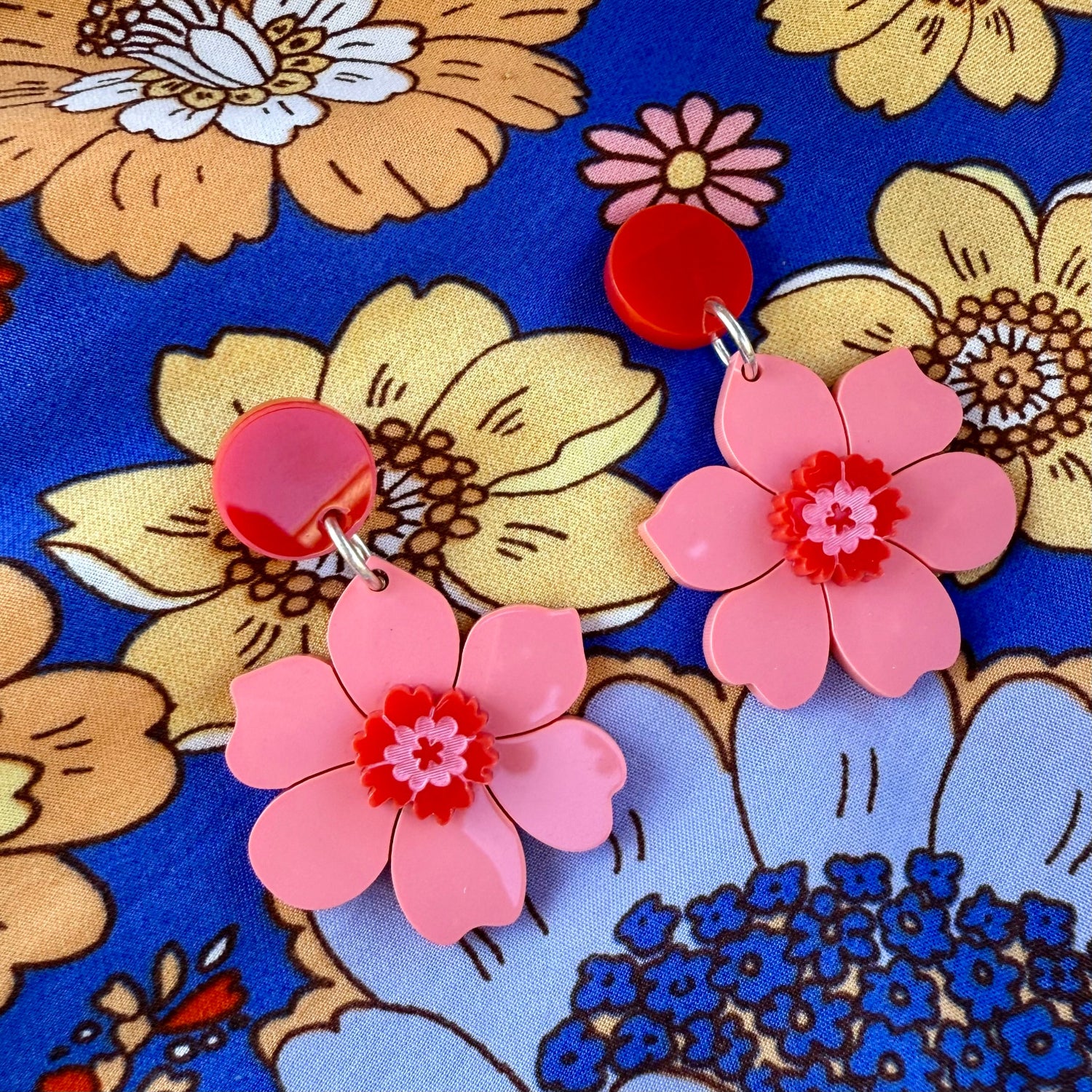 Each flower measures 35mm (w) x 35mm (h) and hangs from a 14mm round stud with stainless steel posts. Overall length is 53mm.